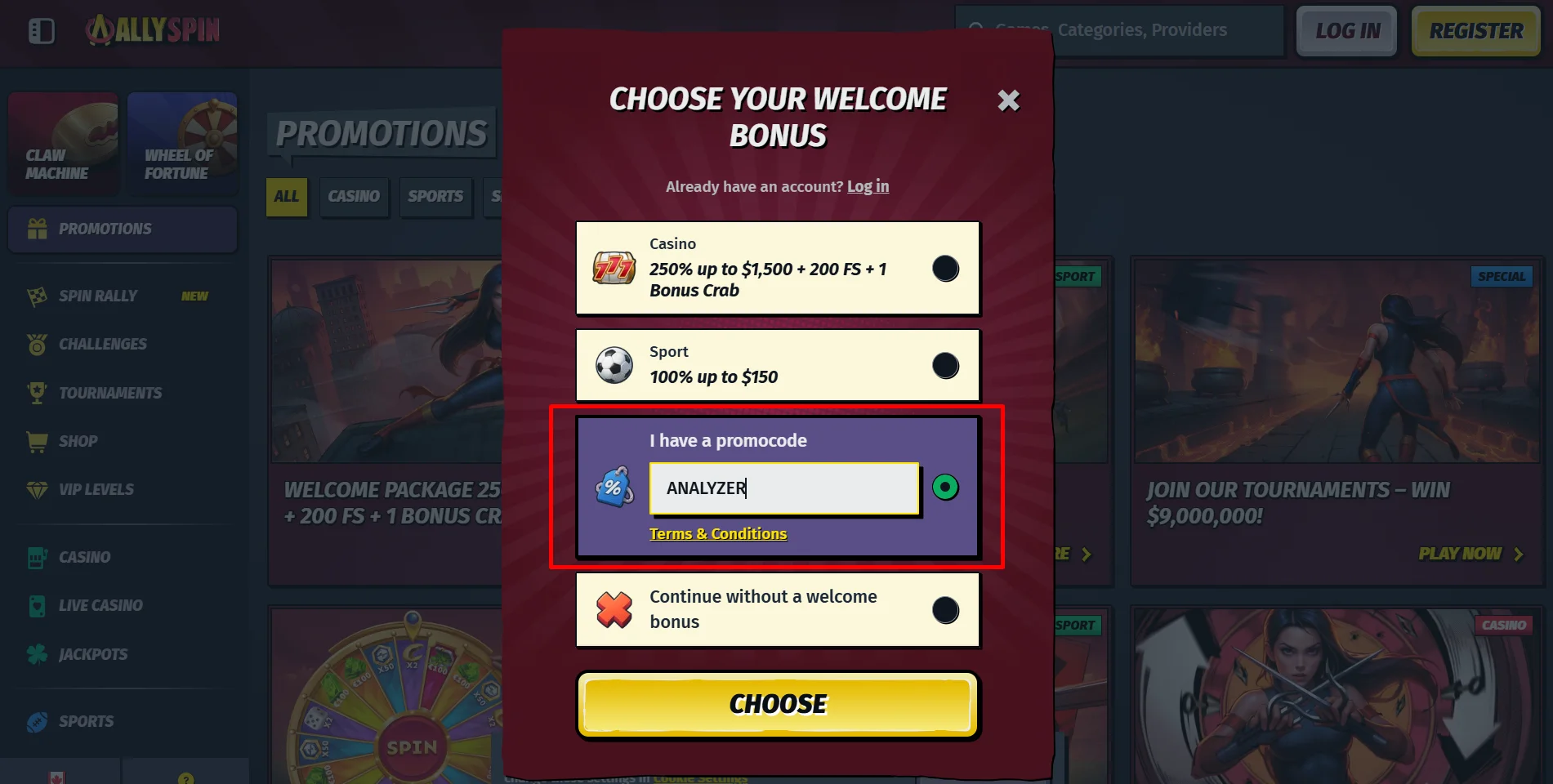 - Register or log in at Allyspin: Create a new account on Allyspin or log in to your existing account. You must have an active, verified casino account to claim a bonus.