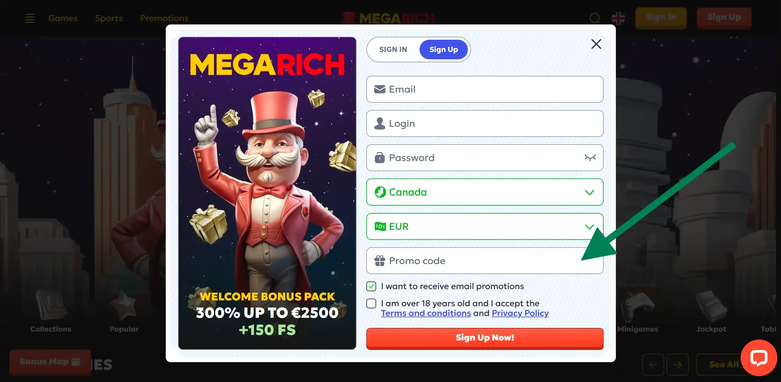 - Indicate your Megarich Casino promo code in a designated box. Last, click Sign Up Now.