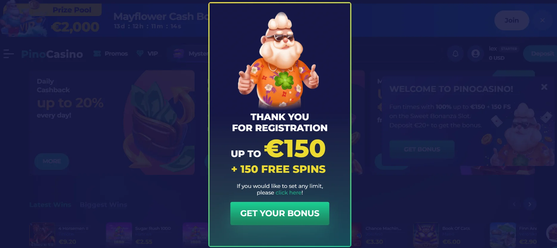 The gambling world will open incredibly efficiently and quickly if you use PinoCasino bonus codes. Great opportunities to return 150 percent of the first deposit of up to $150 will be helpful to all newcomers to the field of gambling. In addition, you can get 150 free spins on Sweet Bonanza, which will improve the chances of a successful game. PinoCasino offers only excellent quality games with great graphics and exciting jackpots. Many well-known providers accord the software (Gamevy, NetEnt, Hot Rise games, Play'N GO, and others). Do not doubt your chances of winning! Open detailed information about bonuses and catch your lucky chance to win.