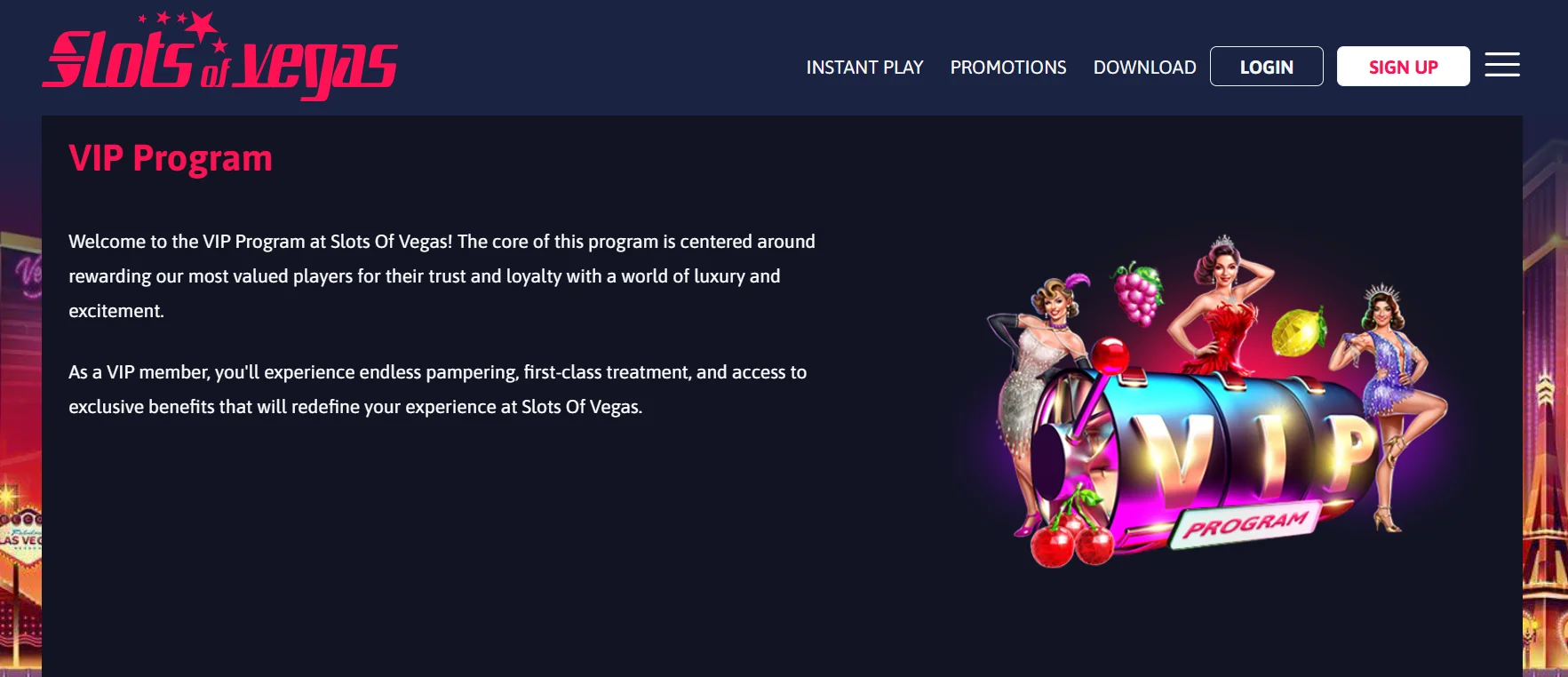 Yes, Slots Of Vegas Casino has provided a loyalty program for its regular visitors. It includes 5 levels, from Silver to Ambassador, at each of which you will find additional privileges and benefits for VIP members. As a member of the VIP club, you receive bonus boosts, weekly and monthly cashback, priority withdrawal of funds, daily free spins, the assistance of an individual VIP host for personalized support, and other advantages.