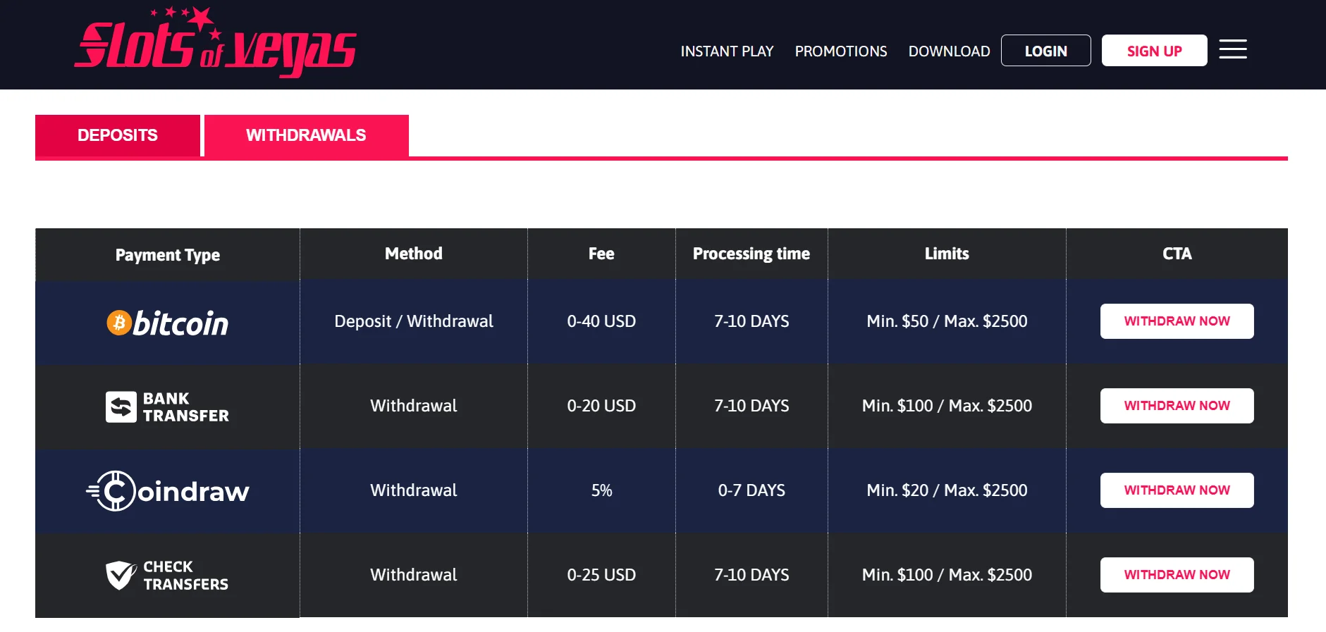 In the current bonus catalog of Slots Of Vegas Casino, there are plenty of advantageous offers, but no active deposit bonuses are now available. However, you can also use other ongoing promotions from this gaming establishment. The full list of current offers is available for studying in our review. We recommend subscribing to our newsletter, where we provide only relevant and useful information about bonuses and reliable casinos.